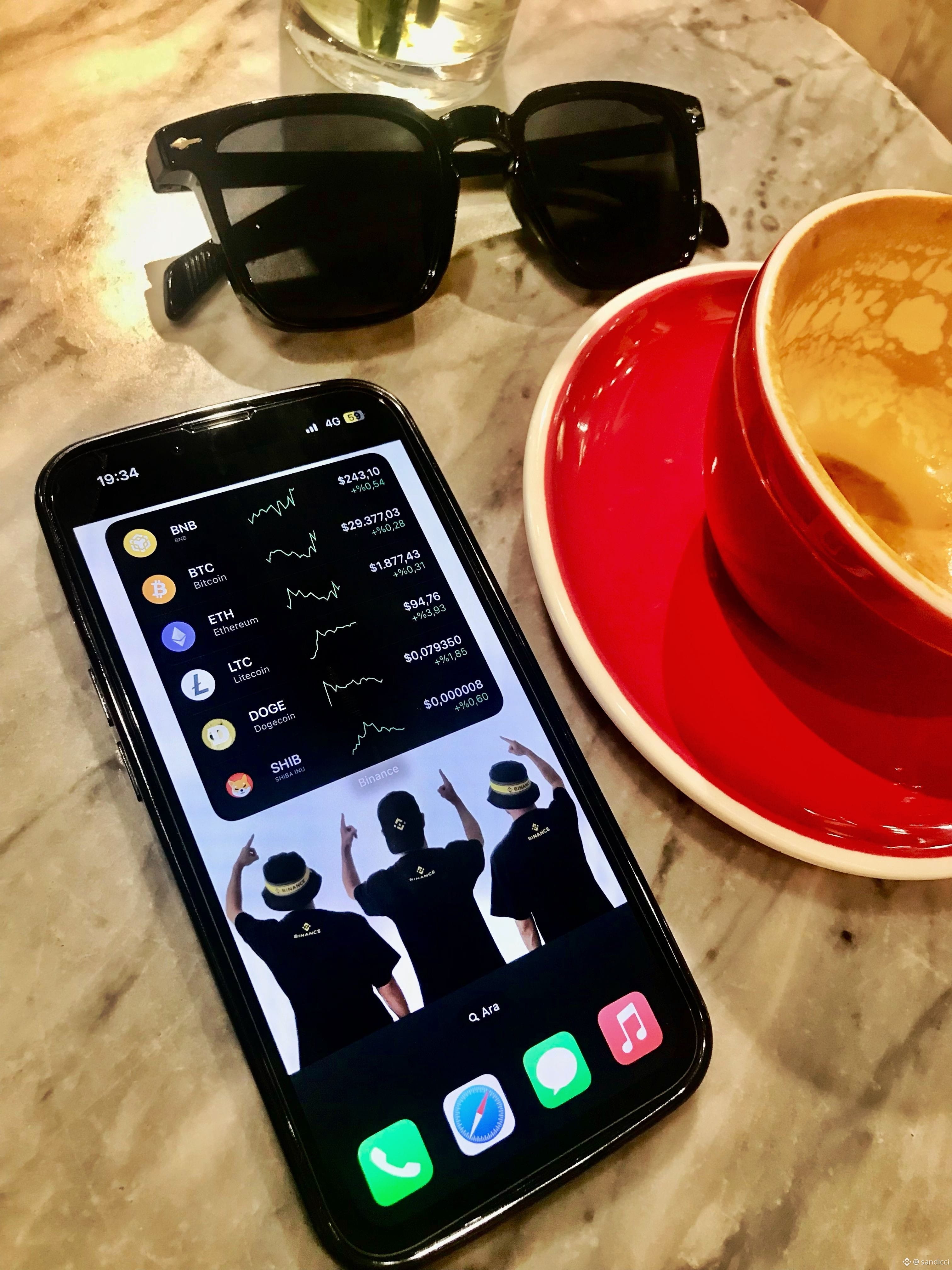 a phone on the table, a cup of coffee, sunglasses aside… and Bitcoin on the screen 📱