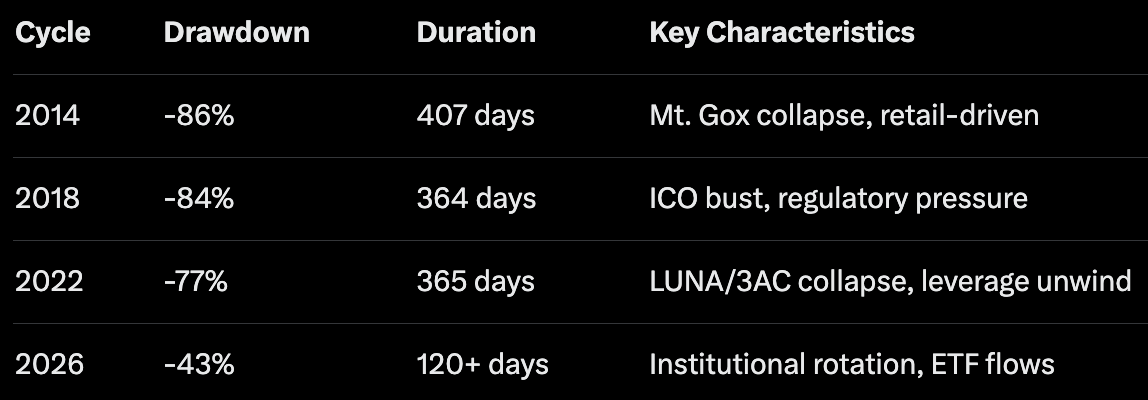Clear difference: current 43% drawdown is mild compared to 77-86% in previous cycles. This reflects a completely different market structure one where institutional money provides a real support floor that never existed before.