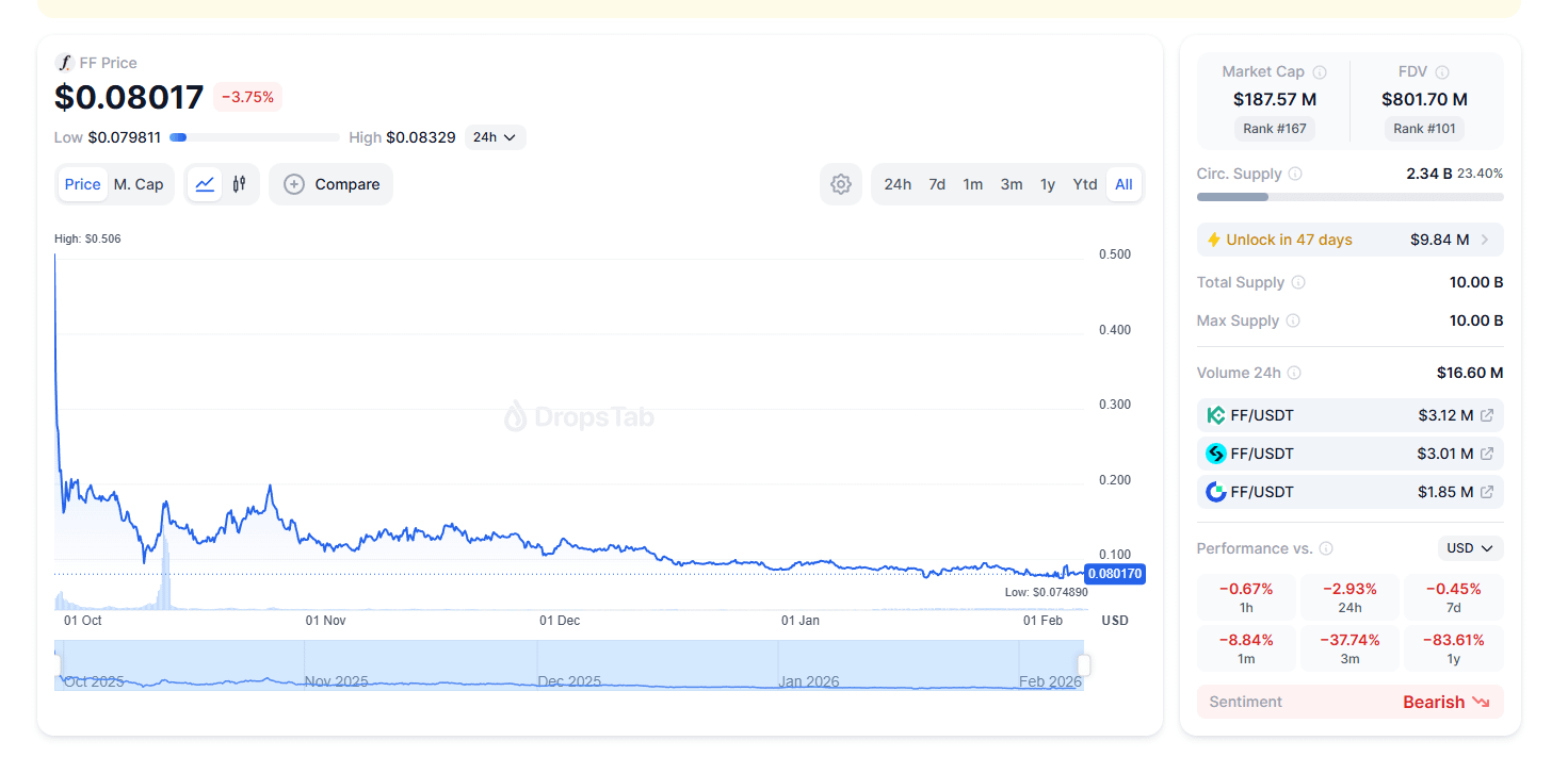 Falcon Finance (FF) là ví dụ điển hình của mô hình FDV cao – nguồn cung ban đầu thấp khi FDV ~800M USD trong khi market cap chỉ ~187M, circulating mới ~23%.