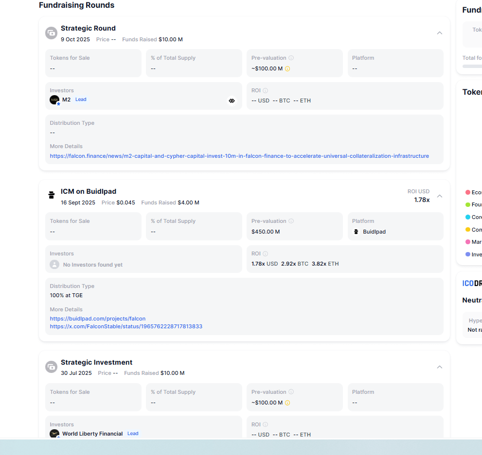 Ví dụ với Falcon Finance, dự án gọi vốn ở các mức pre-valuation ~$100M (Strategic/Strategic Investment) và ~$450M (ICM trên Buildpad), trong khi tổng cung 10 tỷ FF ⇒ giá vốn tương ứng của quỹ chỉ khoảng $0.01/FF và $0.045/FF, nên khi token list quanh $0.08 (FDV ~800M), các vòng sớm đã có lợi thế giá rất lớn, và khi nguồn cung được unlock dần, chỉ cần bán ra từng phần nhỏ cũng đủ tạo áp lực khiến giá suy giảm kéo dài — đúng mô hình FDV cao, cung ban đầu thấp, retail gánh unlock.