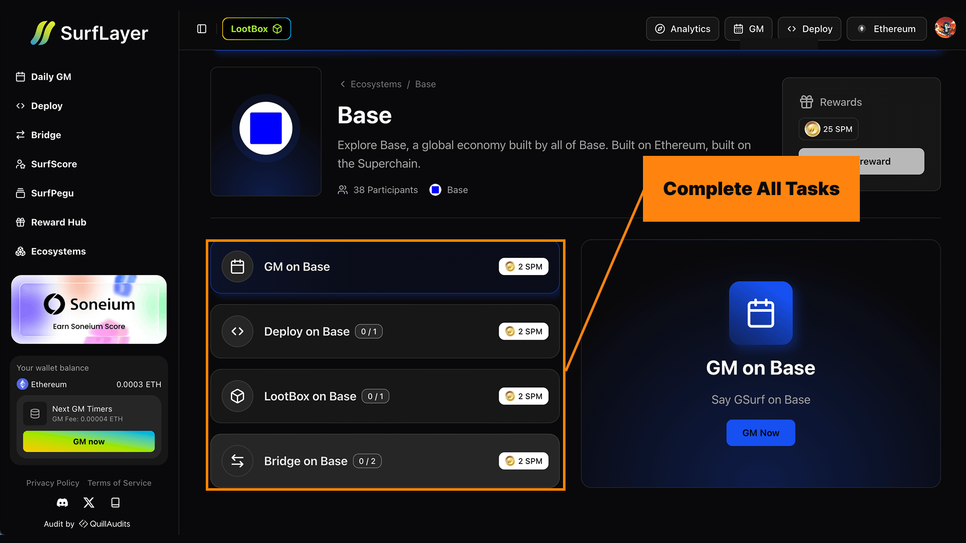 By completing all tasks in the Base ecosystem, users earn bonus SurfPoints (SP) — recognizing consistent, real participation on mainnet.
