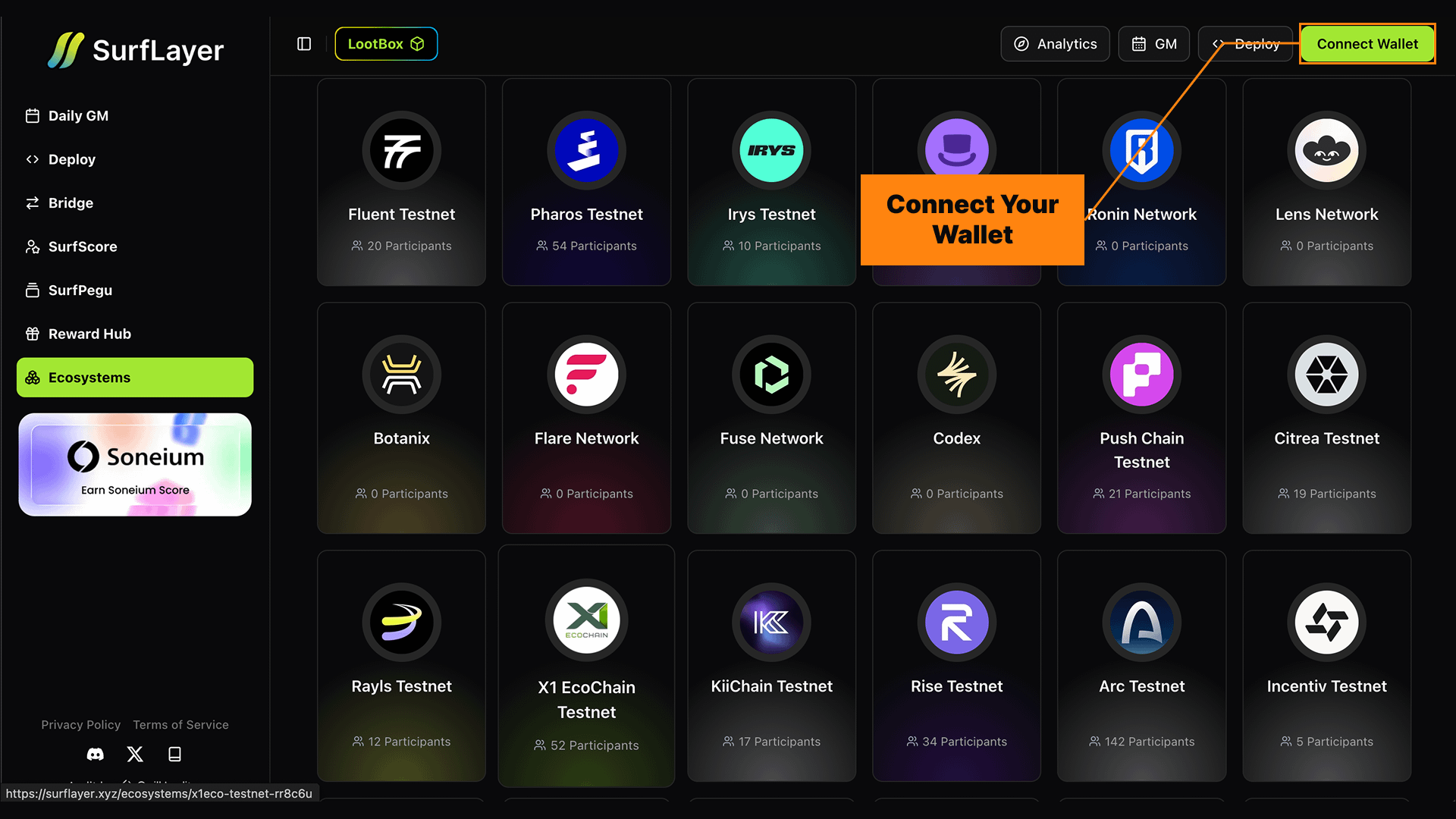 Go to the SurfLayer Ecosystems page and connect your wallet: