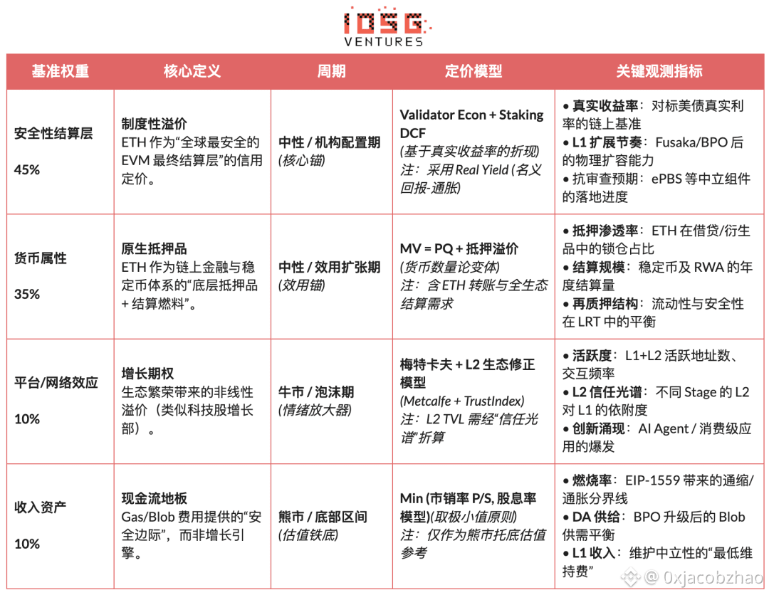 • 估值框架发生结构性迁移: 安全性与机构可信度权重显著上升,手续费与平台效应权重下降,ETH 的定价正从现金流模型转向资产溢价模型。