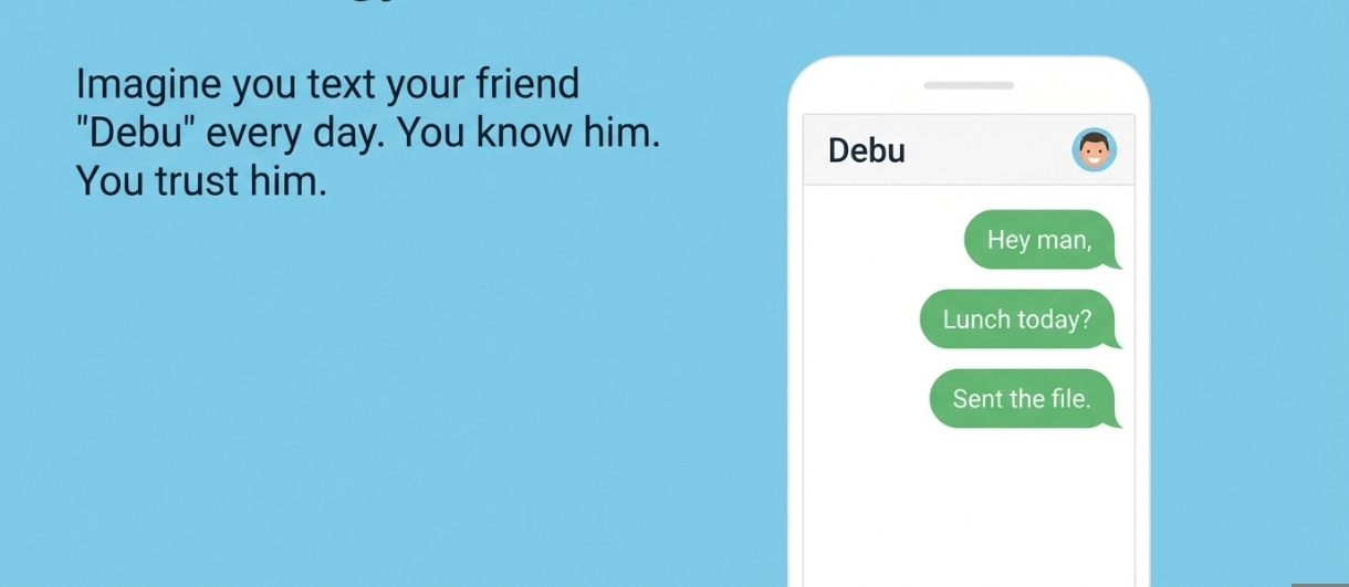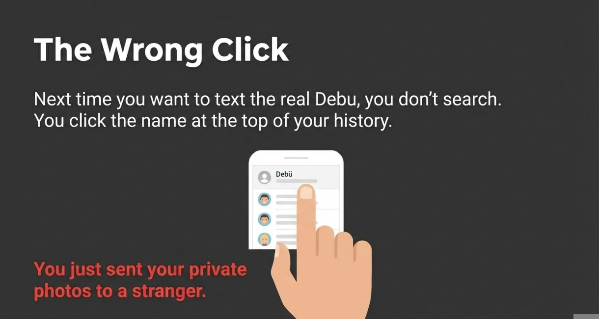 The next time you want to text the real Debu, you don't search for his contact. You just open your messages, click the name at the top (thinking it's him), and send your private photos.