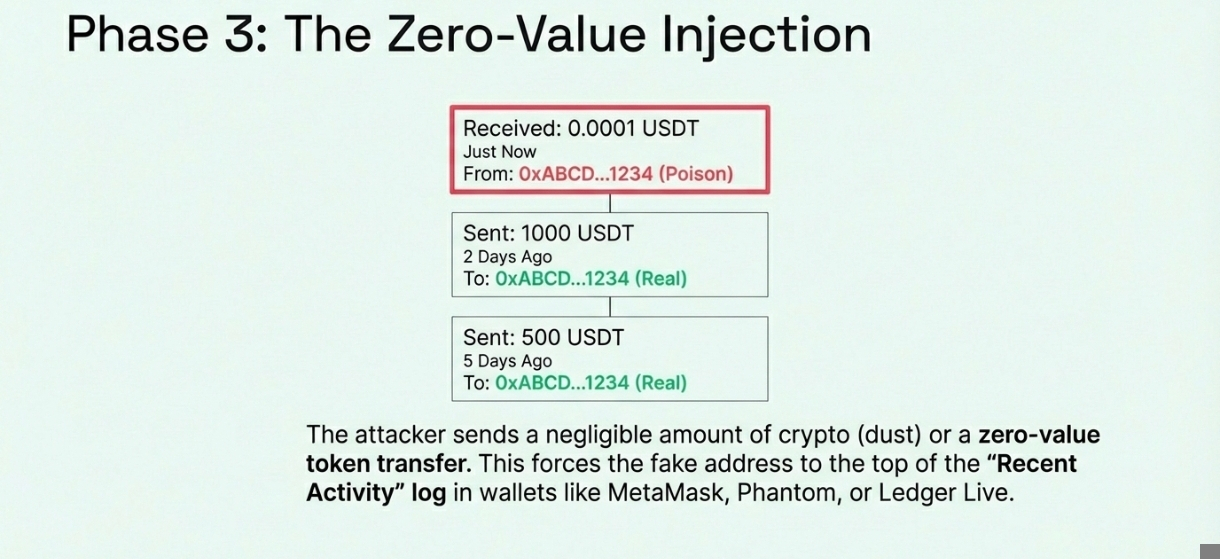 The Injection: The scammer sends you a tiny amount of crypto ($0.0001) or a 0-value token transfer from this fake address.