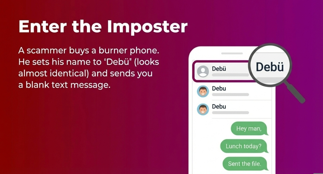 A scammer buys a burner phone, sets his name to "Debü" (looks almost identical), and sends you a blank text message.