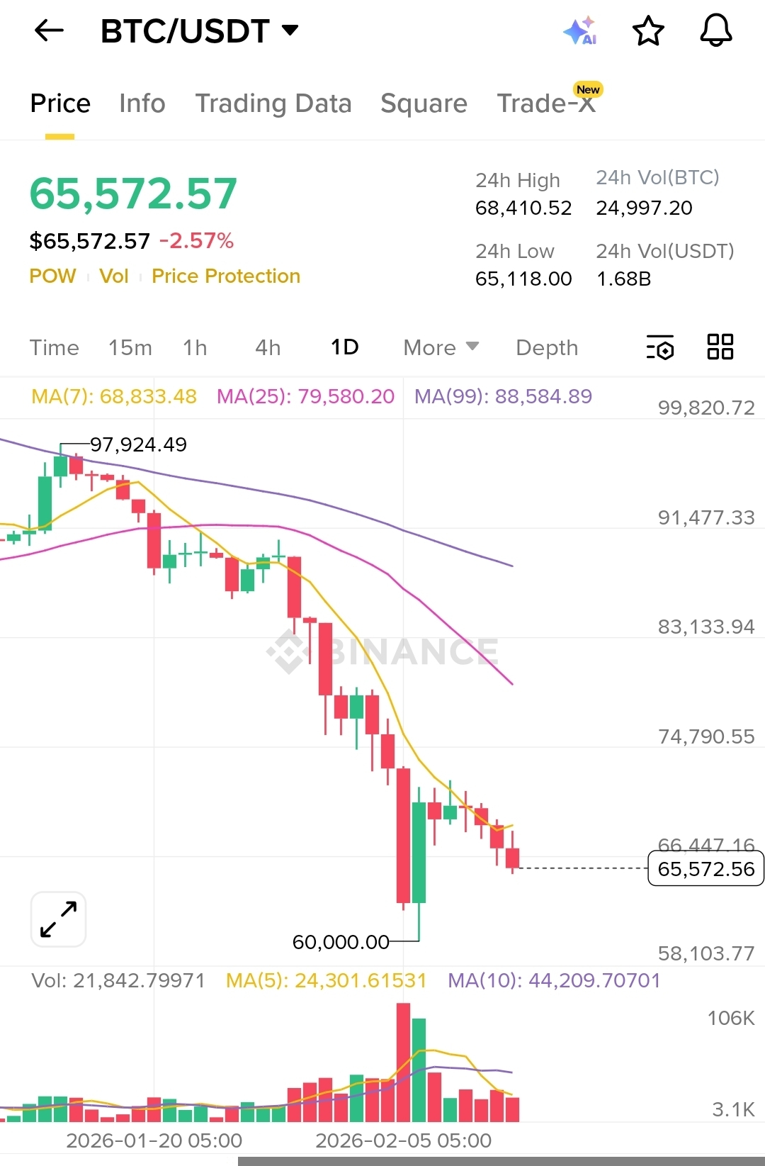 Another major factor visible on the chart is the moving average alignment. The 7-day Moving Average (MA7) is currently around 68,833, the 25-day Moving Average (MA25) near 79,580, and the 99-day Moving Average (MA99) around 88,584. Bitcoin is trading well below all three moving averages, confirming strong downside momentum. When price remains under short, mid, and long-term moving averages simultaneously, it signals sustained selling pressure. Additionally, the earlier bearish crossover — where the short-term MA crossed below the mid-term MA — likely triggered algorithmic and technical selling.