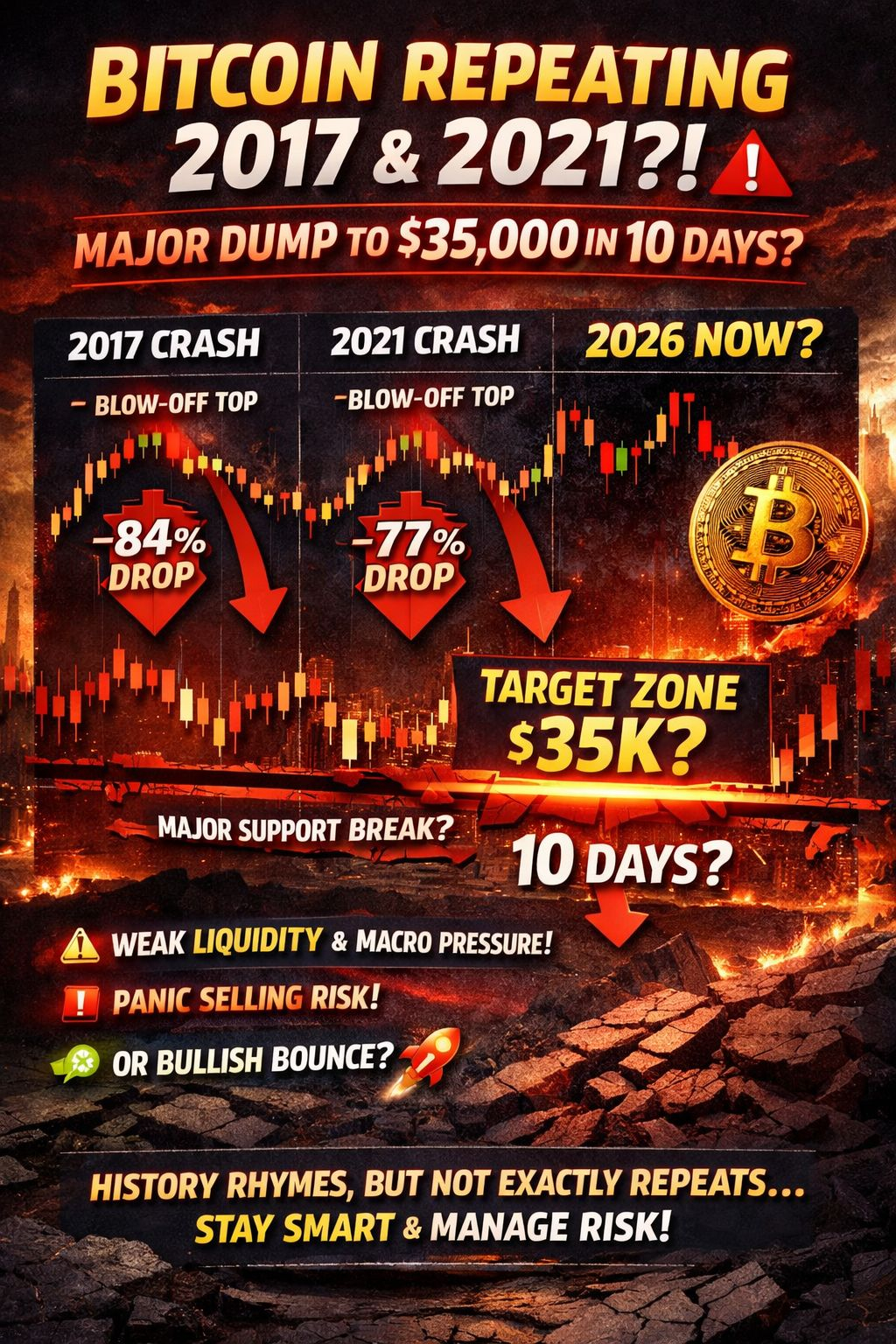 Many traders online are claiming that Bitcoin $BTC) is following the same pattern it showed during the 2017 and 2021 bull-bear cycle peaks, with some predicting a deep crash toward $35,000 within the next 10 days. Let’s break this down clearly and realistically.