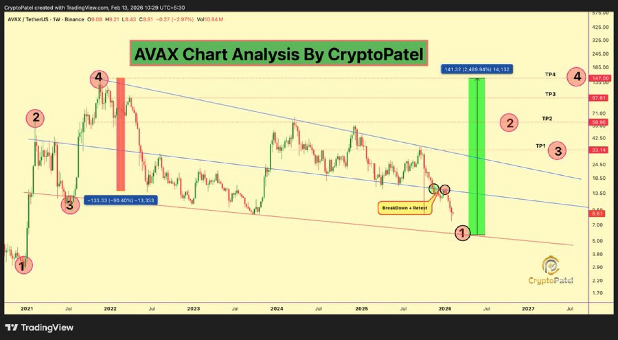 After enduring a brutal 95%+ drawdown from its 2021 peak, Avalanche is now showing early signs of a potential high-timeframe reversal. With price stabilizing at macro support and forming an emerging Elliott Wave structure on the weekly chart, the current phase could mark a critical turning point in the broader cycle. Weekly Elliott Wave Structure Signals Macro Inflection AVAX is currently forming an Elliott Wave structure on the weekly chart, trading within a massive descending channel that has remained intact since the 2021 all-time high. The broader structure suggests the asset is still operating within a long-term corrective phase, but key technical signals now point to a potential higher-timeframe inflection point. Related Reading: Avalanche Shows Signs Of Recovery As Key Indicator Flashes A Buy Signal – Details According to Crypto Patel, after enduring a brutal 95%+ cycle correction, Avalanche appears to have completed Wave 1 with a macro low near $5.67. Price is now transitioning into the early stages of a Wave 2 recovery phase, a critical moment in the Elliott Wave sequence that often determines whether a sustainable expansion phase can follow. Structurally, the weekly chart shows several notable developments. Wave 1 seems to have finalized within the $8–$5 macro bottoming zone, establishing a potential base of support. At the same time, price continues to trade within the long-term descending channel that has defined the broader downtrend. Technically, the chart reflects a clean bearish breakdown followed by a retest of the lower trendline, a classic deviation setup. Additionally, AVAX executed a liquidity sweep into the weekly demand zone between $8 and $7. Meanwhile, the overall fractal structure also mirrors the compression phase seen in the previous cycle before expansion. For confirmation, Crypto Patel emphasizes the need for sustained weekly strength and expansion back toward mid-channel resistance. A decisive push in that direction would strengthen the bullish Wave 2 thesis and signal that the larger recovery structure is beginning to unfold. Avalanche Upside Roadmap: $33 To $147 In Focus CryptoPatel outlines an ambitious upside roadmap for Avalanche, projecting sequential targets at $33, $58, $97, and ultimately $147. Should the broader channel expansion scenario play out into 2026–2027, price could trend toward the upper boundary of the multi-year descending channel. From the macro bottom to the final target, that would represent an estimated 2,489% expansion. Related Reading: Avalanche (AVAX) Defies Bear Market With Explosive On‑Chain Growth, Messari The bullish thesis remains intact as long as Avalanche holds above $5.50 on a weekly final support, which marks the Wave 1 low and last major structural support. Maintaining this level preserves the higher-timeframe recovery structure and keeps the Wave 2 continuation scenario in play. However, a confirmed weekly close below $5.50 would invalidate the setup and signal structural weakness. As it stands, this remains a high-timeframe, patience-driven opportunity with asymmetric risk-to-reward, a framework best suited for spot accumulation and long-term holders. Featured image from Getty Images, chart from Tradingview