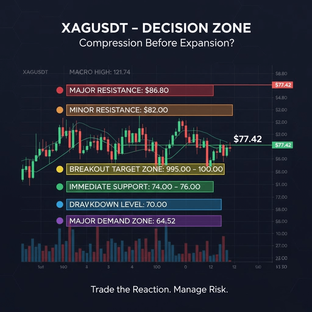 $XAG XAGUSDT is currently trading near $77.42, consolidating after a strong rejection from the $86–$88 resistance zone. On the 4H timeframe, price structure shows a clear macro high at $121.74 followed by an aggressive selloff into the major swing low at $64.52. That low now acts as a key higher-timeframe demand zone. Since bouncing from $64.52, price has been forming a medium-term range between $74 support and $86 resistance, indicating accumulation or distribution before the next expansion phase.