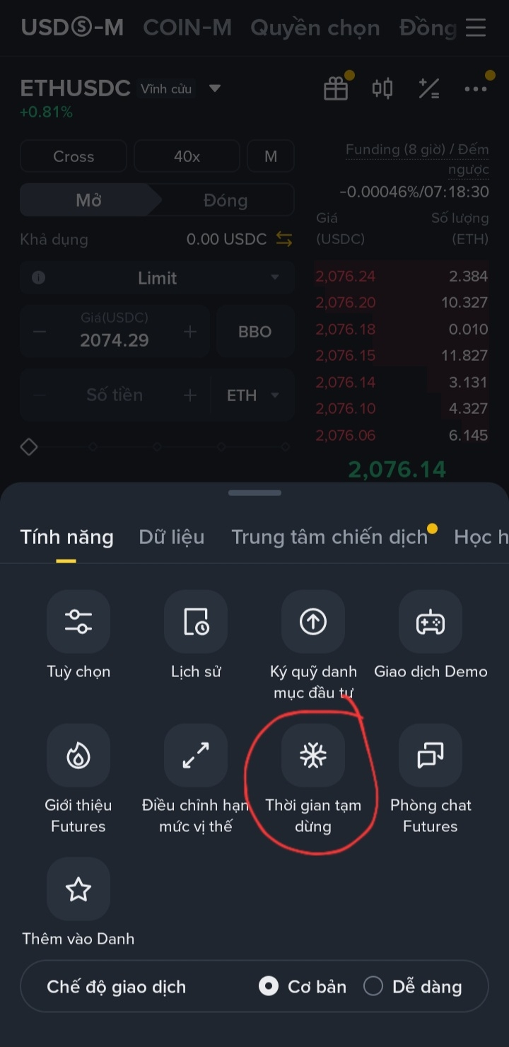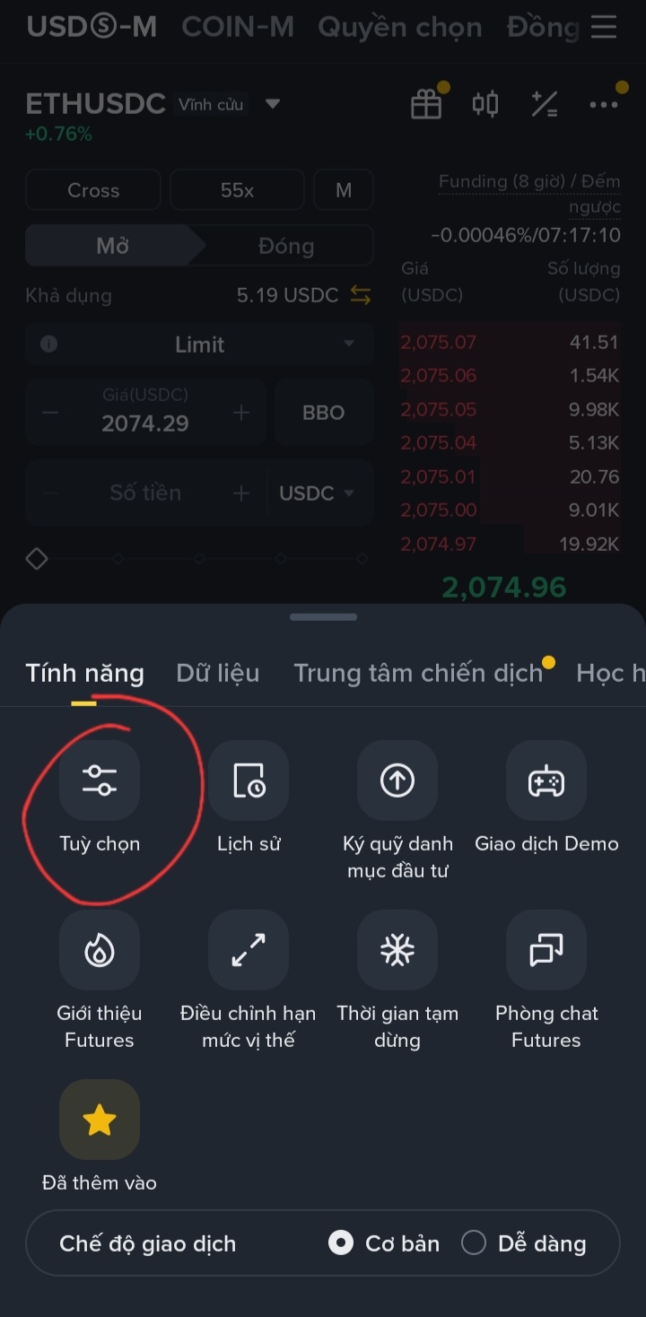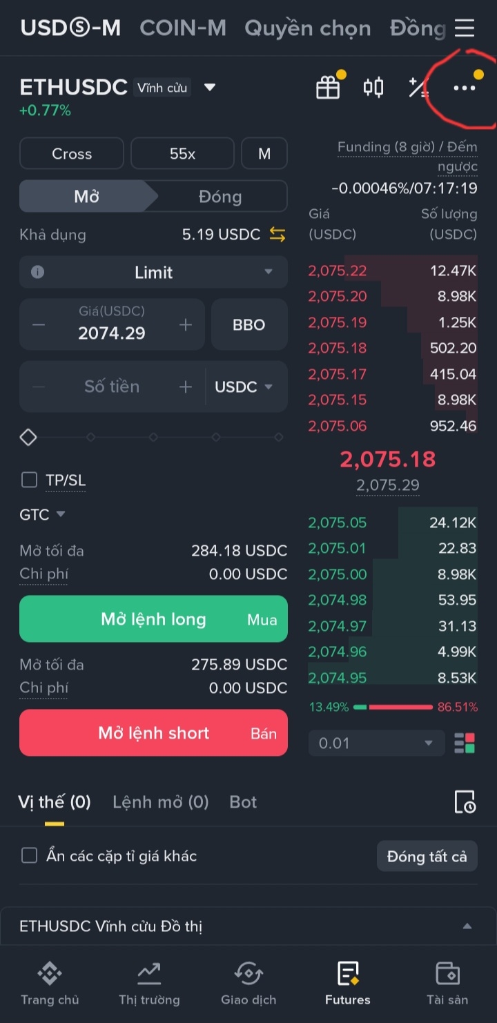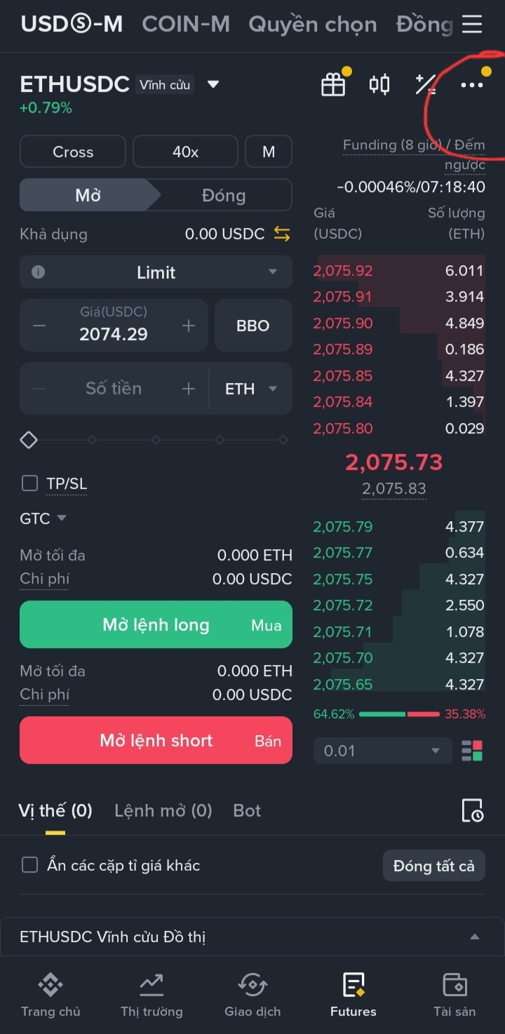 1. Tại màn hình đặt lệnh Futures, nhìn lên phía trên, ngay cạnh tên cặp coin (ví dụ BTCUSDT).