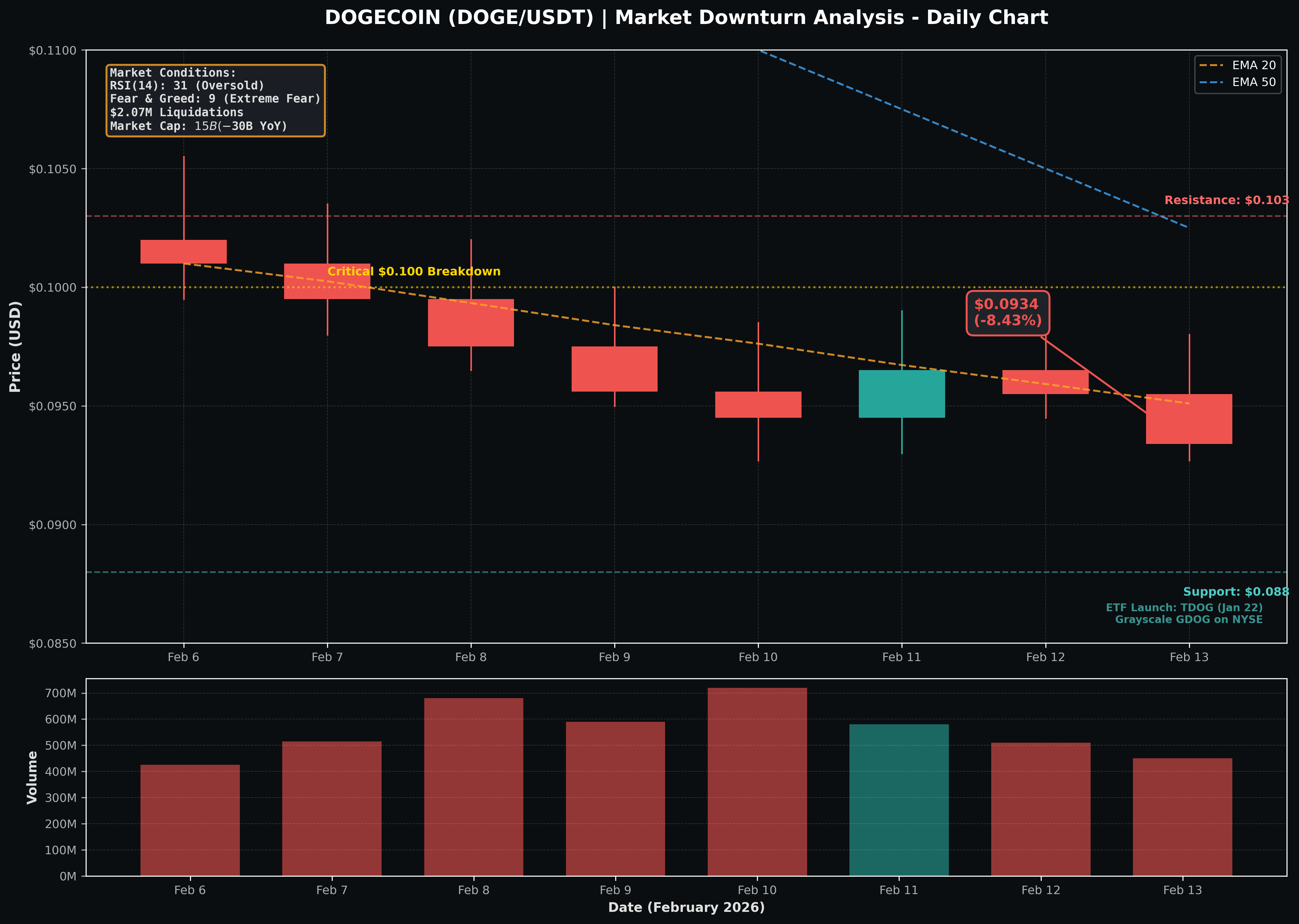 Current RSI readings of 31 indicate oversold territory, historically preceding significant rebounds. However, momentum indicators remain bearish with MACD crossover intact and price trading below all major EMAs. The $0.088-$0.092 support zone represents the final defense before potential acceleration toward $0.072.