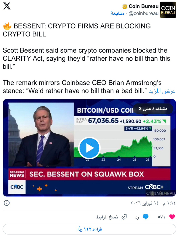 بُثّ مؤخراً مقطع من مقابلة مع وزير الخزانة الأميركي، سكوت بيسنت، على قناة CNBC، وجّه فيه اتهامات مباشرة إلى بعض أطراف قطاع العملات المشفرة. وكتب بيسنت أن عدداً من شركات الكريبتو عملت بشكل فعّال على عرقلة تطوير قانون CLARITY لتنظيم سوق الأصول الرقمية. ووفقاً له، تفضّل هذه الشركات عدم إقرار أي قانون على تمرير هذا القانون بصيغته الحالية. وتسلّط تصريحاته الضوء على التوتر القائم بين الجهات التنظيمية وقادة القطاع في مرحلة مفصلية من التشريعات.