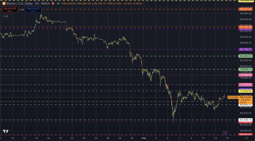 Về mặt cấu trúc, thị trường đang hình thành một vùng nén giá ngay dưới kháng cự. Đây thường là giai đoạn quyết định: hoặc bứt phá khi cung cạn dần, hoặc sụp khi người mua mất kiên nhẫn. Nếu Bitcoin reclaim và giữ vững trên 71.500 USD với khối lượng tốt, xác suất mở rộng lên 73.700 – 77.000 USD sẽ tăng đáng kể. Ngược lại, mất 65.000 USD sẽ làm suy yếu cấu trúc hiện tại và đưa 60.000 USD trở lại tầm ngắm — vùng ký ức của cú sụt mạnh trước đó.