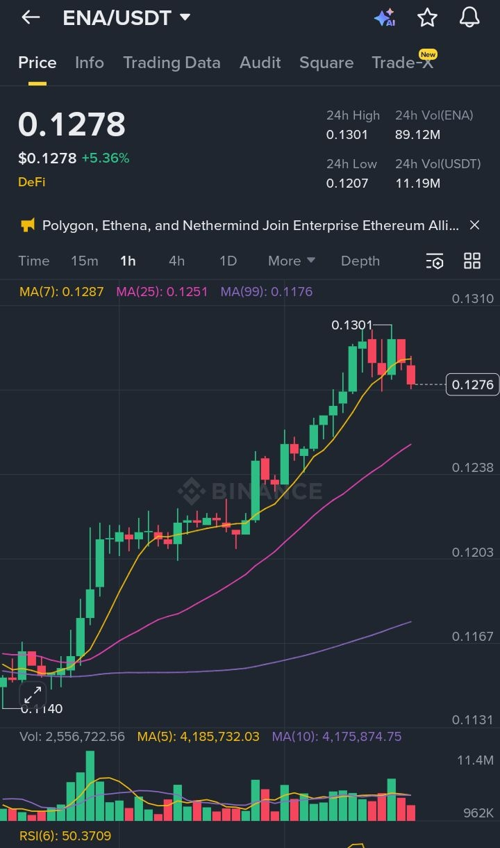 ENA jumped 5.36% today as Polygon, Ethena, and Nethermind collaborate on Enterprise Ethereum Alliances. Growing DeFi adoption and platform updates are fueling this upward move.