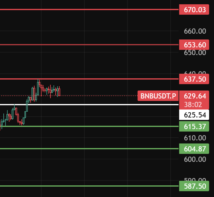 如果今天跌破625这个位置后收不上来,那4小时级别开始回调,下方支撑位留意615-604-587这几个位置附近!#BNB走势