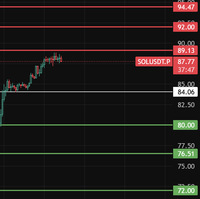 如果今天跌破84这个位置后收不上来,那4小时级别开始回调,下方支撑位留意80-76-72这几个位置附近!#solana