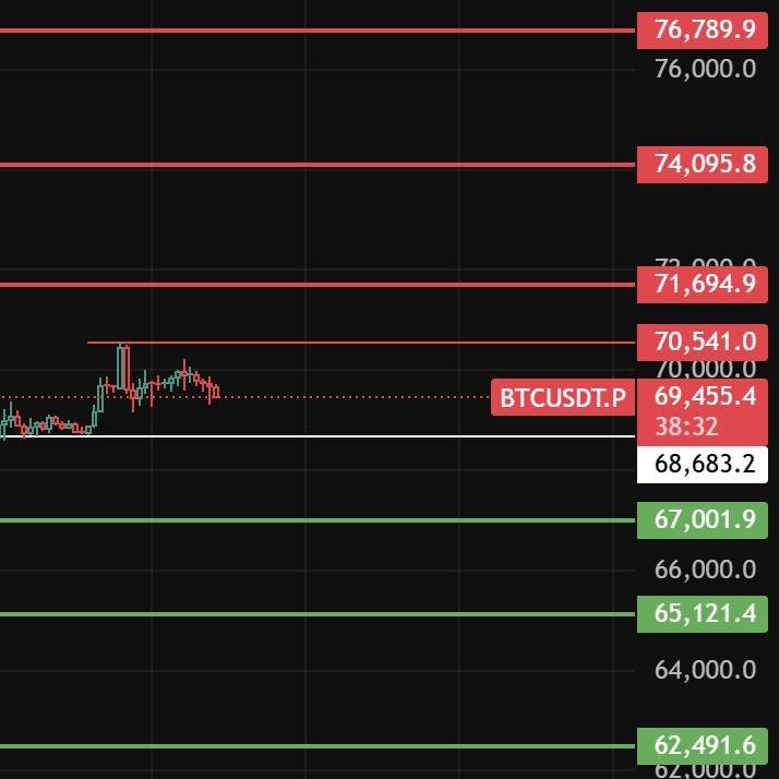 大饼今天留意68680这个位置,只要回踩不破此位置那4小时级别多头趋势依旧在,小级别回踩一下也还会继续上行,上方压力位71700-74100-76790这几个位置附近!
