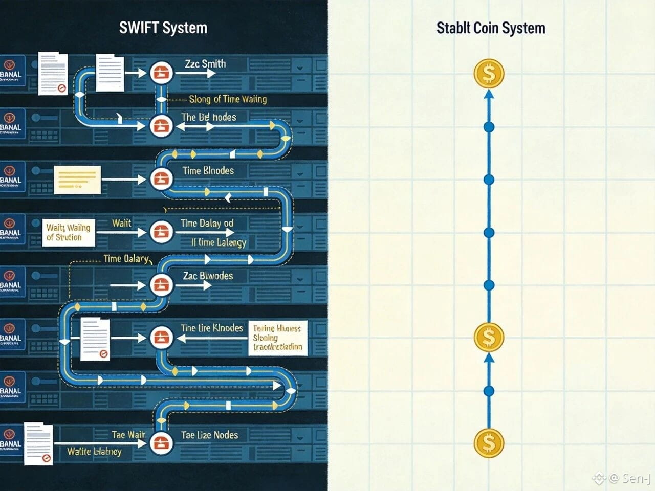 传统上,SWIFT只传「谁付谁、付多少」的信息,真金白银的清算走CHIPS、Fedwire和央行,要数小时甚至几天。稳定币把信息和结算并成一步,链上「即时结算」:转过去就算结完,不用等银行轧差。