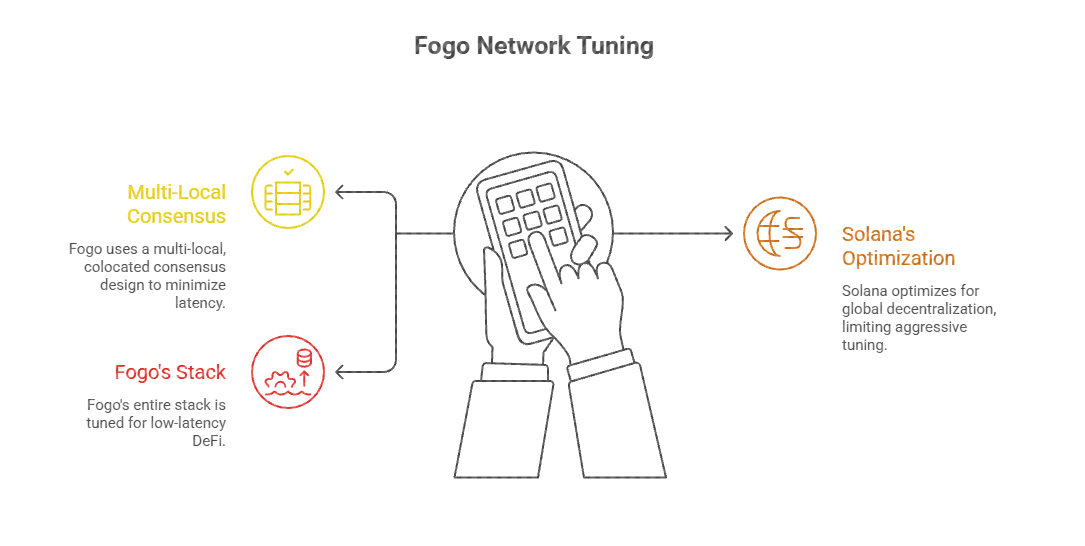 Fogo combines Firedancer with a multi‑local, colocated consensus design (e.g., validators initially concentrated in Tokyo near major exchanges) to minimize physical latency as well as software latency.