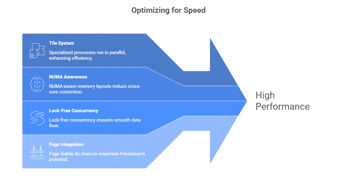 Firedancer is architected for ultra‑fast networking and parallel processing (tile‑based architecture, custom QUIC/UDP stack, kernel bypass), which dramatically reduces propagation and processing delays.