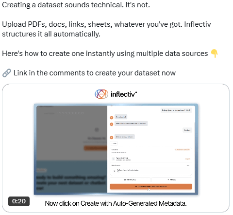 Upload PDFs, documents, links, spreadsheets, and Inflectiv structures everything automatically and turns it into AI-ready intelligence in minutes.