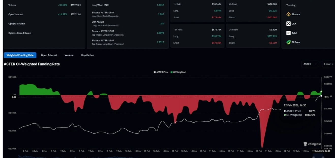 يمتد تعافي أستر (ASTER) لليوم الثالث على التوالي مع مكاسب تقارب %9 في وقت كتابة هذا التقرير يوم الخميس، حيث يقترب من حاجز 0.750 دولار. وقد تعاونت البورصة اللامركزية (DEX) التي تركز على العقود الآجلة مع محفظة بينانس لتحدي تداول العقود الآجلة على السلسلة يوم الخميس. تظهر بيانات المشتقات أن الطلب من التجزئة على ASTER لا يزال مرتفعًا حتى الآن هذا الأسبوع، مما يعزز الفائدة المفتوحة الخاصة به