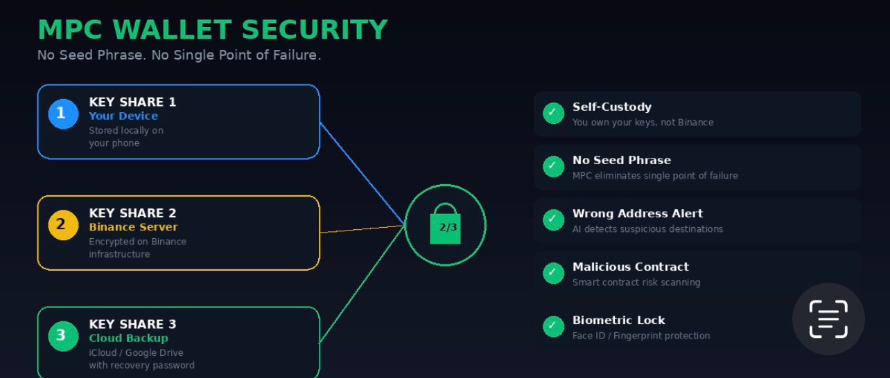 Now, none of these fancy AI tools matter if your wallet isn't secure. This is where Binance's MPC (Multi-Party Computation) technology comes in, and it's genuinely next-level. Instead of generating a traditional seed phrase — those 12 or 24 words that you're terrified of losing — the wallet creates three separate key shares stored in different locations: one on your device, one on Binance's server, and one encrypted in your cloud backup with a personal recovery password.