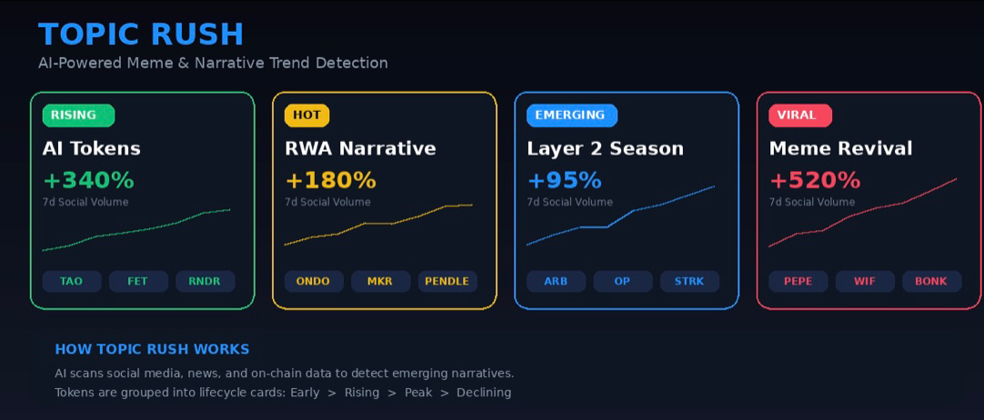 This is probably the most exciting tool of the three. Topic Rush uses artificial intelligence to scan social media posts, news articles, and on-chain activity to identify emerging narratives in real time. Instead of you spending three hours scrolling through Crypto Twitter trying to figure out what's hot, Topic Rush does it in seconds.