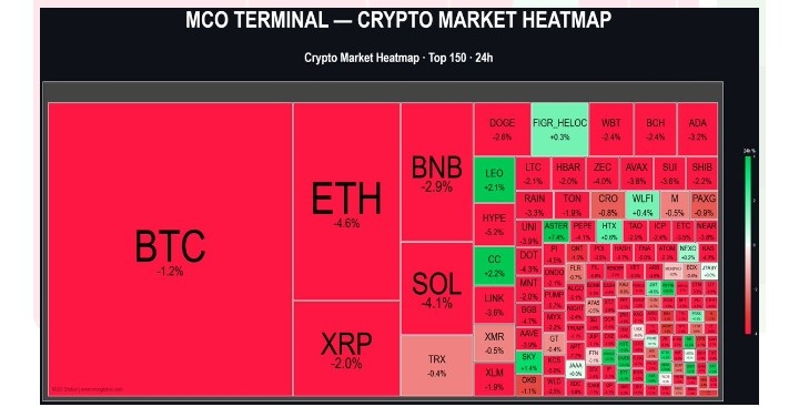 In live market heatmaps, BTC is always the largest tile (by far the biggest market cap). ETH is the second-largest. Colors shift in real time — BTC has been light green in recent snapshots (+1%), while ETH has toggled between light green and neutral/light red depending on the exact hour.Here are real examples of current-style crypto heatmaps (tiles sized by market cap, colored by 24h performance):