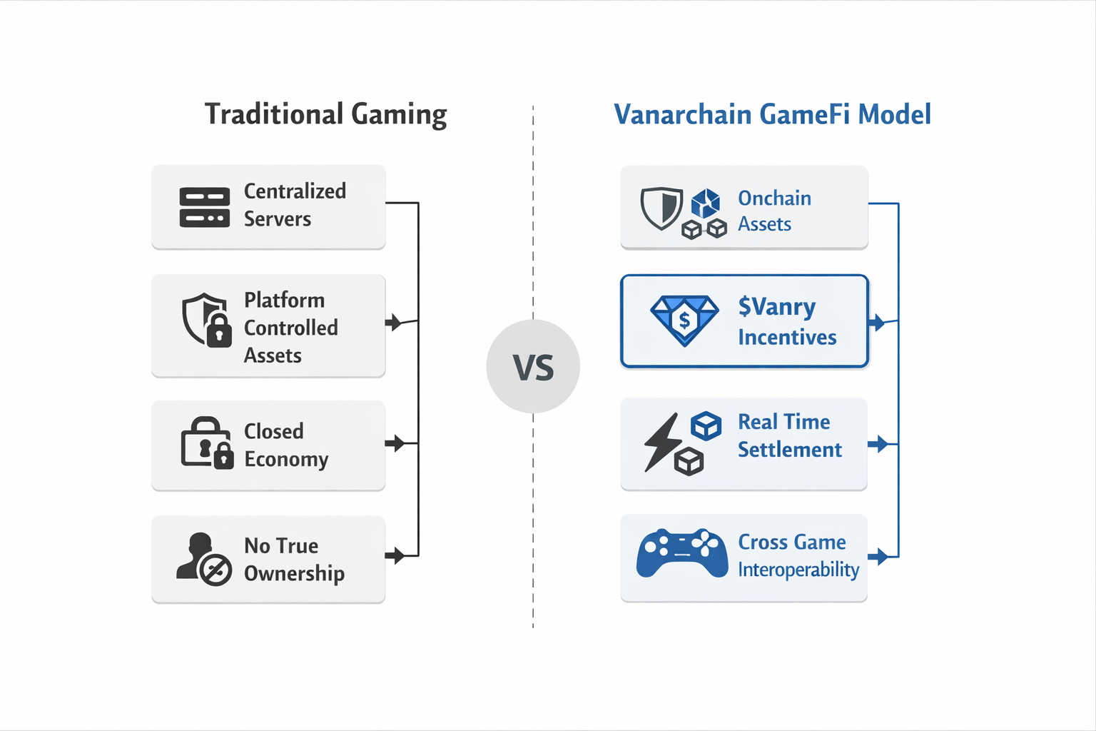 Traditional Gaming vs Vanarchain GameFi Model Highlighting the Shift from Centralized Control to Onchain Ownership Powered by $Vanry Incentives