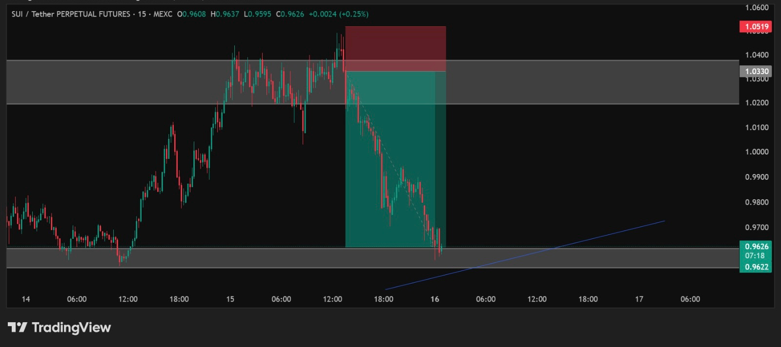 On $SUI 15 min time frame entry was executed by a doji candle followed by a red inverted hammer bearish reversal.