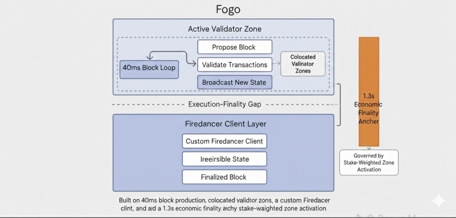 On Fogo’s SVM-compatible Layer-1, blocks print every 40ms. Firedancer executes clean, memory tight, parallel lanes disciplined. Inside the active zone, validators sit physically close — propagation loops compressed, vote returns predictable.