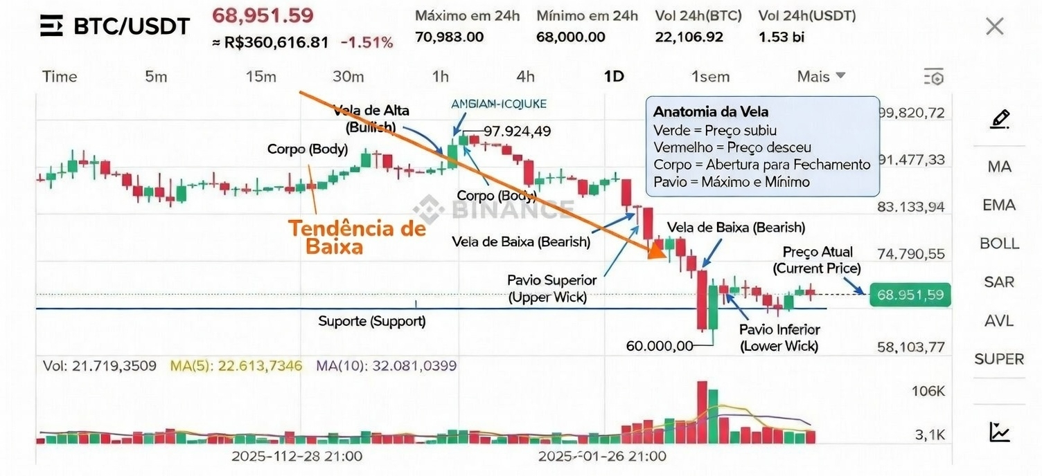 O gráfico mostra um candle de baixa com pavio inferior alongado, indicando que o suporte dos US$ 68.000 foi testado e, por enquanto, segurou. O volume segue consistente, com mais de 22 mil BTC negociados nas últimas 24h.