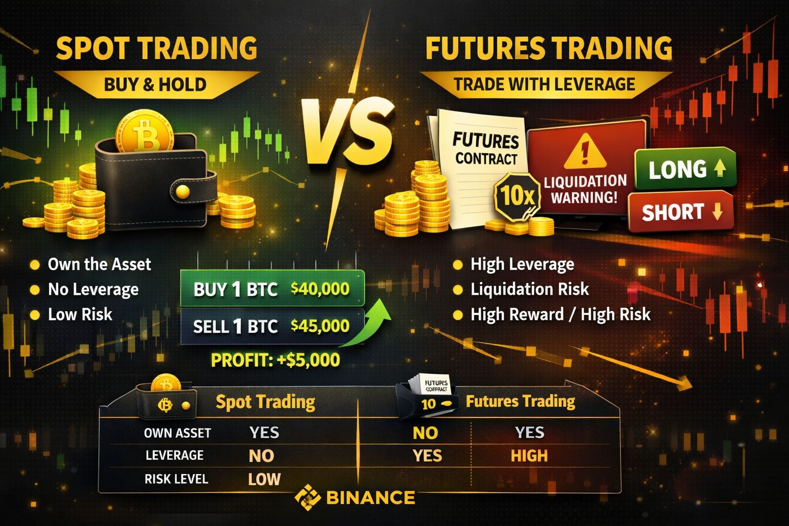 FeatureSpot TradingFutures TradingAsset ownershipYesNo (contract only)LeverageNoYesLiquidation riskNoYesBeginner friendlyYesNot reallyCan profit in down marketNoYes (shorting)