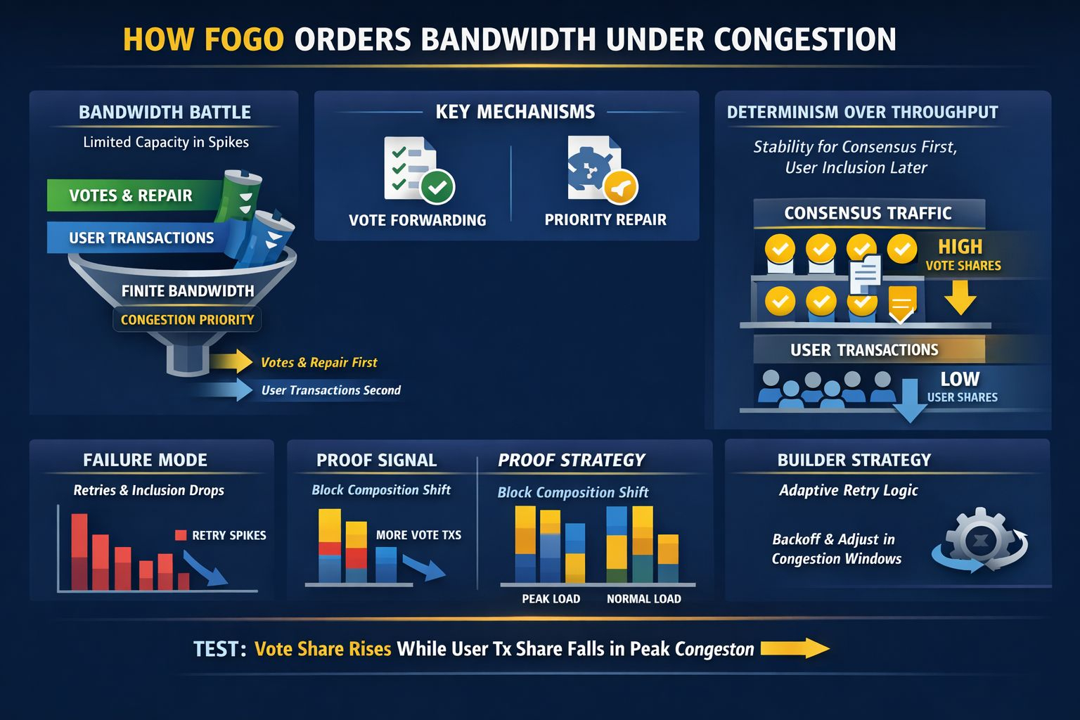 When demand spikes, the network does not have unlimited room to carry every kind of message at full speed. On Fogo, vote forwarding and priority repair support sit right on that choke point. They make a clear ordering choice: keep votes moving and recover missing shreds first, even if that means user transactions get pushed to the side for a window.