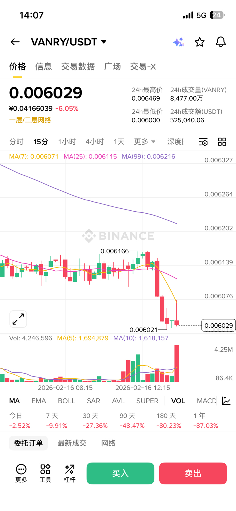 另外,Binance 那边的合约/交易页也能看到它的流通量、成交等数据,基本能和上面互相对照。