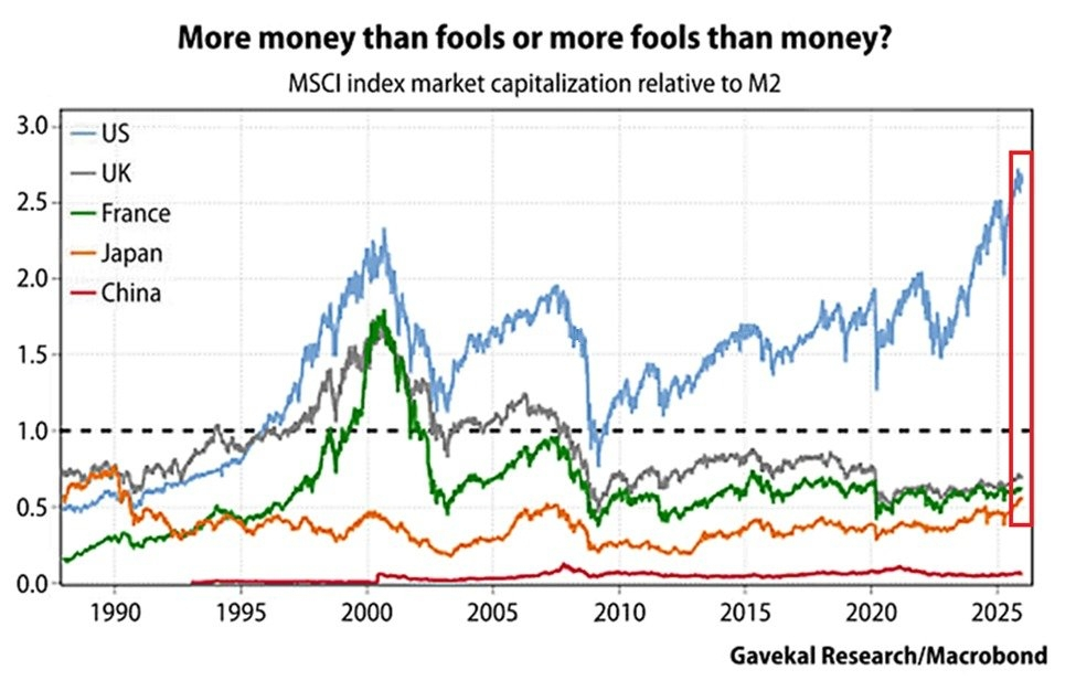 Europe (UK & France): The MSCI indexes for the UK and France are trading at ~60% of their respective M2 money supplies. Crucially, these levels are still below their pre-pandemic highs, suggesting no irrational exuberance in European equities.