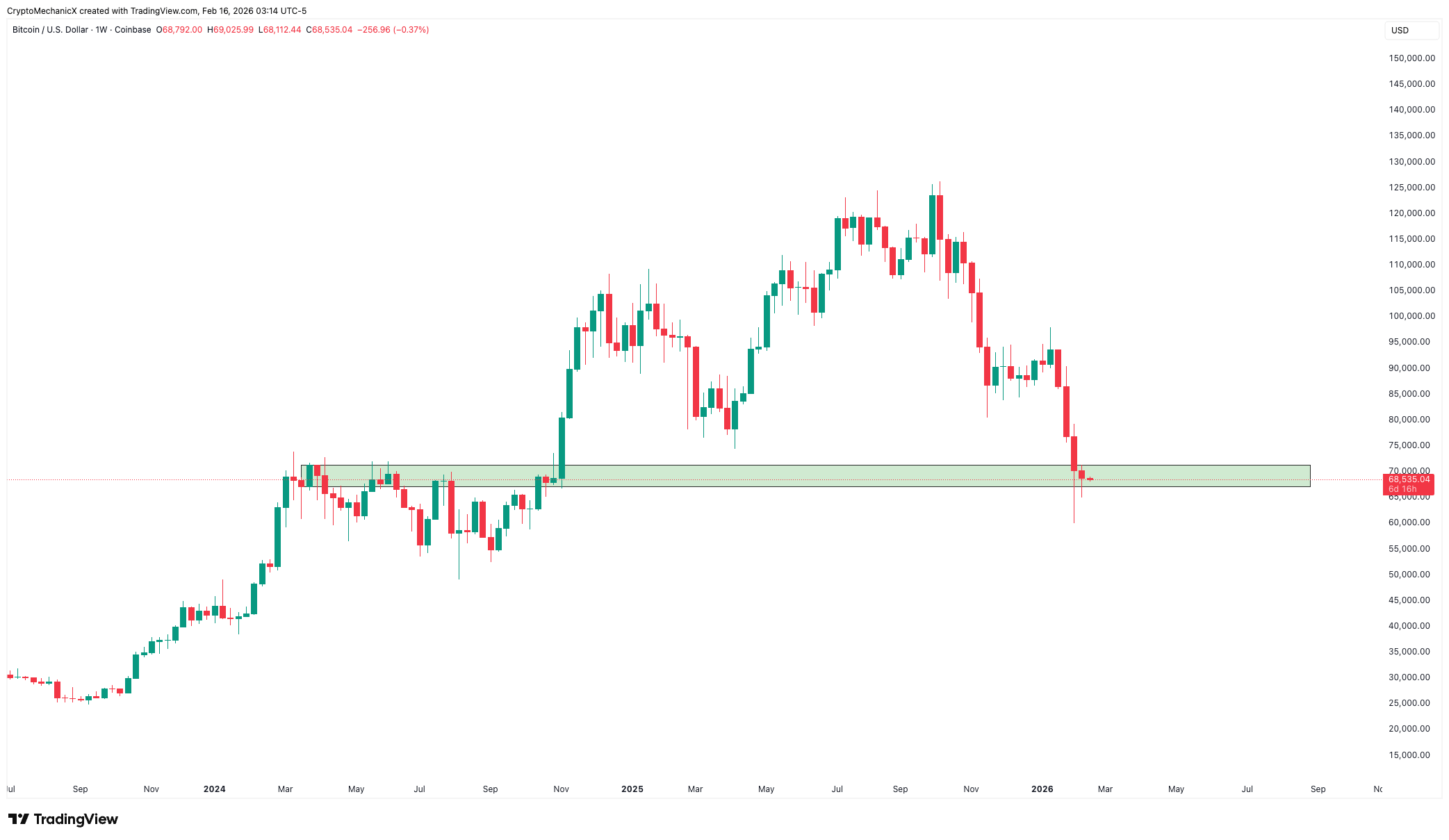 The monthly chart has been in an uptrend since the $16K bottom. The last higher low was formed around $74K, and the price is currently trading below it. A monthly close below $74K would break the bullish structure on the monthly timeframe.