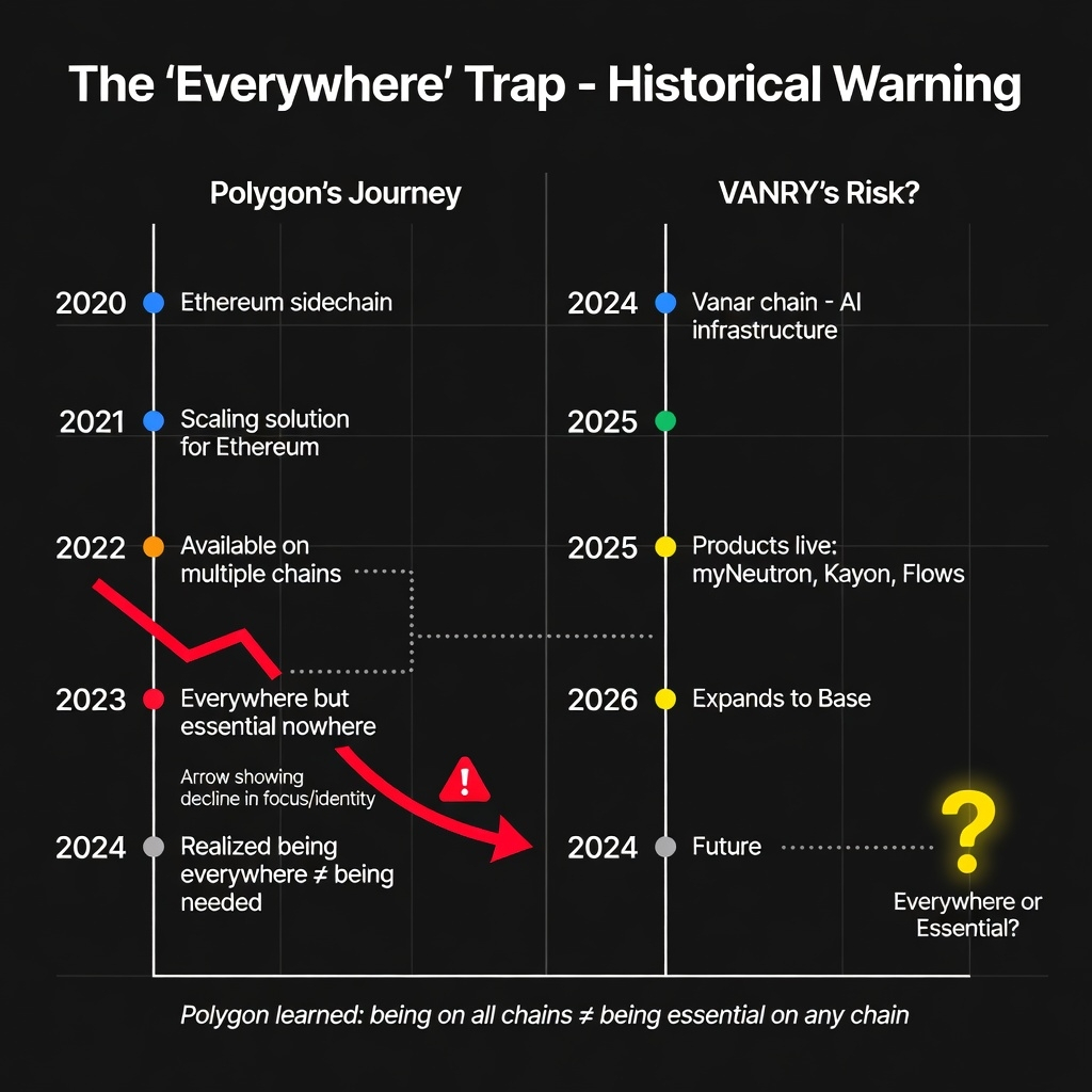 we've seen this pattern destroy projects before. Polygon spent years as "Ethereum's sidechain" and eventually realized being everywhere meant being essential nowhere.