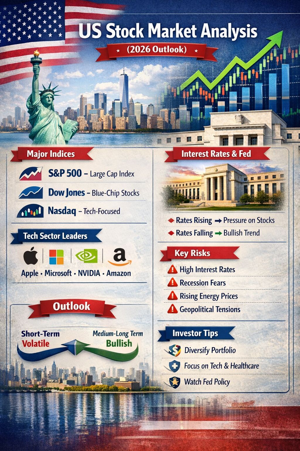 The United States stock market is considered the primary barometer of the global economy. Its direction is mainly driven by four key factors: technology sector performance, interest rates, inflation, and geopolitical conditions.