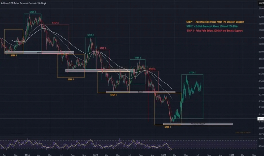 $ARB has been moving in 3-step phases. Currently we are again in Step 1, where the next phase should be the movement back above the EMAs.