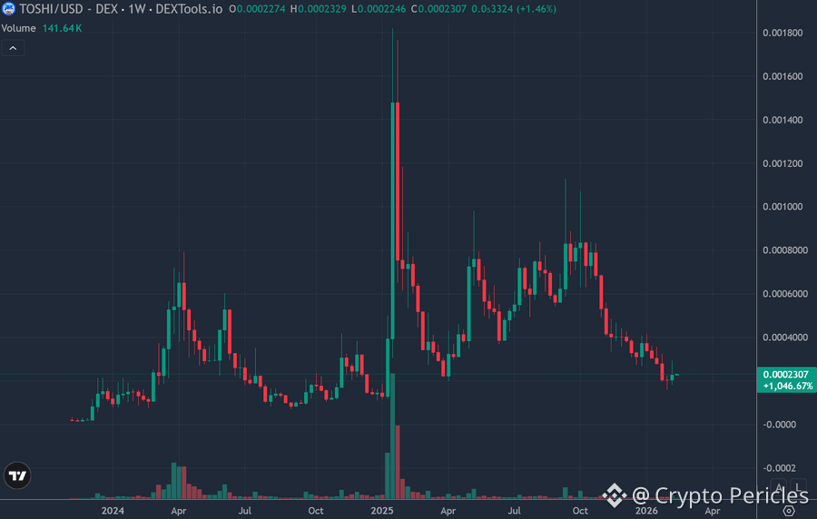 $TOSHI after deep correction from 2025 ATH, weekly candles stabilizing near $0.00023 support.