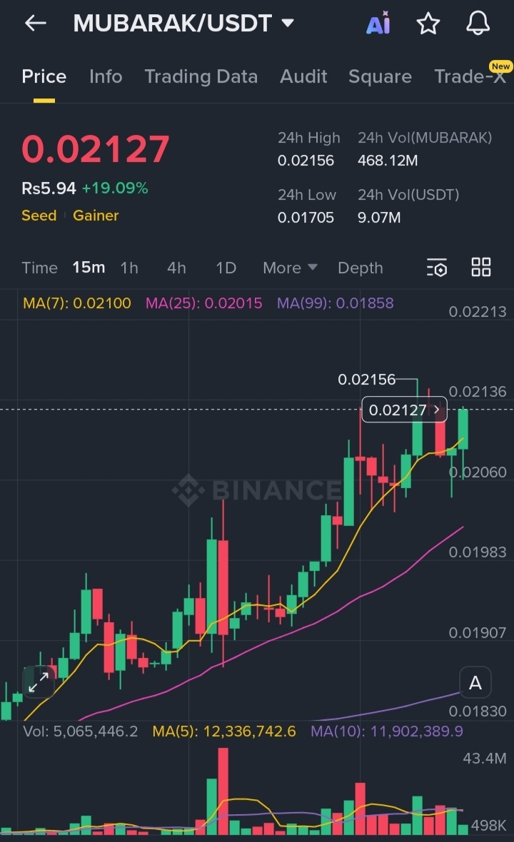 $MUBARAK Update: The price pump toward 0.02156 (+19% on the day) is primarily driven by strong short-term momentum and a clean continuation breakout structure on the 15m timeframe. Price has been forming higher highs and higher lows, supported by bullish moving average alignment (MA7 > MA25 > MA99), which confirms trend strength. The breakout above the 0.02060–0.02080 resistance zone triggered momentum entries and likely activated stop losses from short-term sellers. Volume expansion during the impulse leg shows real participation rather than a low-liquidity spike, while the steady climb afterward suggests controlled accumulation instead of a sharp one-candle squeeze. The 7-day performance (+52%) further indicates sustained buying interest rather than a random pump.