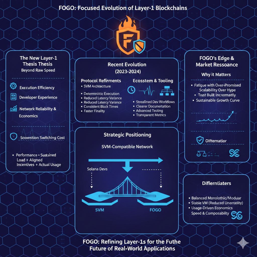 In a market where Layer-1 blockchains are launching faster than narratives can keep up, Fogo is positioning itself not as a loud disruptor, but as a focused evolution of what high-performance chains should already be delivering. Over the last year, the conversation around base layers has shifted from raw transaction speed to a more nuanced mix of execution efficiency, developer experience, network reliability, and economic sustainability. Fogo enters this phase with a clear thesis: performance only matters if it can be sustained under real load, aligned with incentives, and translated into actual usage rather than benchmark screenshots. This mindset is shaping recent updates, its current standing, and the way it compares with other systems competing for the same builders, liquidity, and attention.
