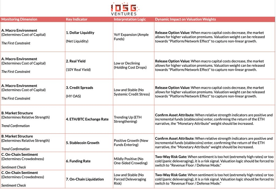 If the previous text established Ethereum's "intrinsic value pivot," this chapter introduces an "external environment adaptation system" independent of fundamentals. Valuation cannot operate in a vacuum and must be constrained by three major external factors: Macro Environment (Cost of Capital), Market Structure (Relative Strength), and On-Chain Sentiment (Crowdedness). Based on this, we constructed a Regime Adaptation mechanism to dynamically adjust valuation weights across different cycles—releasing option premiums during loose periods and retreating to the revenue floor during risk-off periods, thereby achieving a leap from static models to dynamic strategies. (Note: Due to space limitations, this article only presents the core logical framework of this mechanism.)