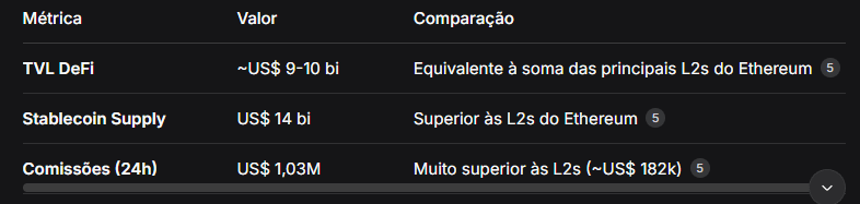 O valor total bloqueado (TVL) da rede, embora oscile, mantém-se como o segundo maior do mercado, atrás apenas do Ethereum .