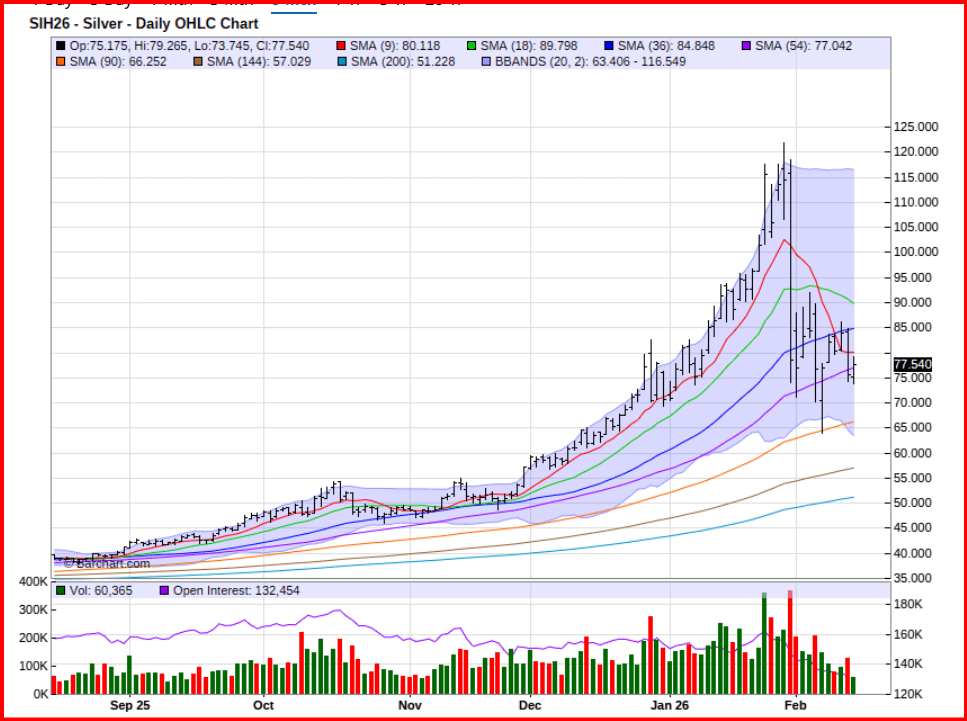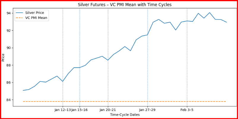 As of February 17, 2026, silver futures are trading in a mean-reversion structure around the VC PMI equilibrium—a balanced zone near 76-77. This consolidation signals a transition from holiday-induced volatility to renewed bullish momentum. The VC PMI (Volume-Weighted Composite Price Momentum Indicator) acts as a pivot: holding above it suggests accumulation by smart money, while dips below could trigger corrections.
