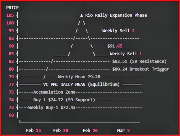 February 20-24: Confirmation phase. Holding above the weekly mean of 79.28 often leads to expansion toward sell targets at 84.80 and 91.65. This marks the Rio Rally ignition, as capital floods back post-holidays.