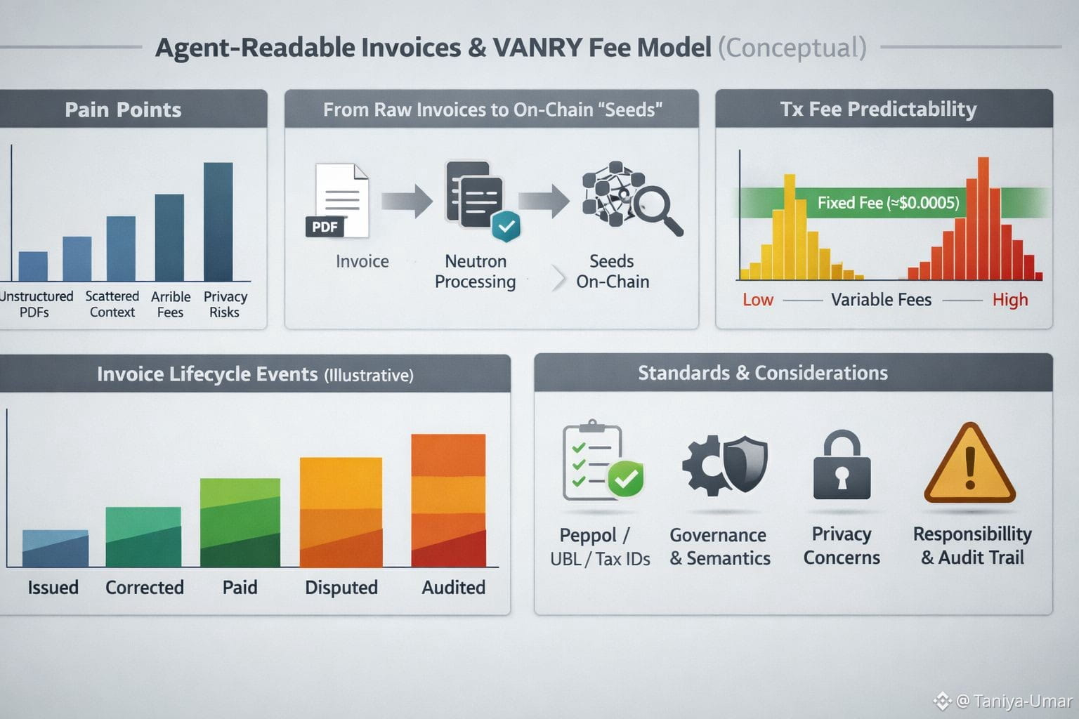 Right now I care because the volume is rising. More invoices are arriving as structured data, more teams want automated checks, and more payment rails are blending with records. If Vanar can make receipts and invoices genuinely queryable while keeping fees boringly predictable in VANRY terms, it could reduce the friction that keeps finance work stuck in PDFs. I just don’t know yet whether the semantics will stay clean when the real world gets messy.